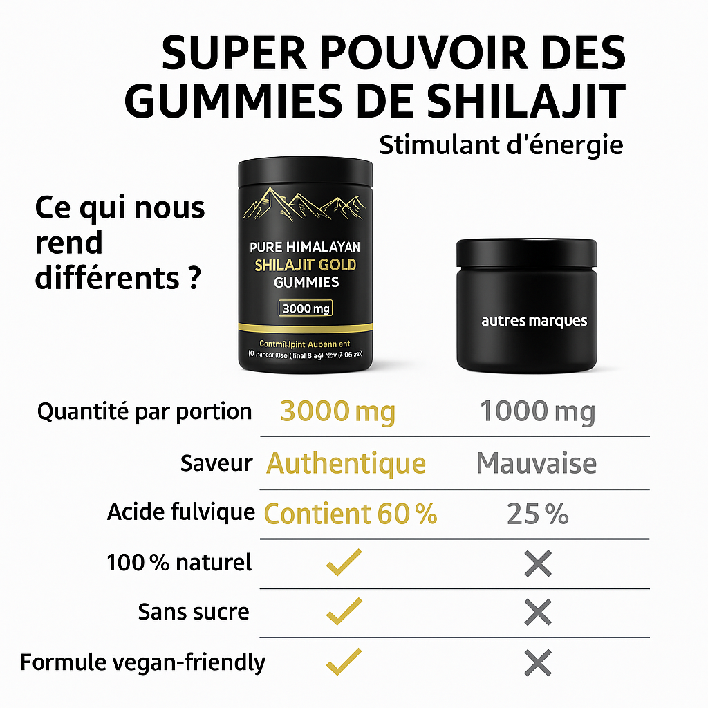 Formulés à base de Shilajit pur de l’Himalaya, nos gummies stimulent naturellement la production de testostérone, boostent l’énergie, améliorent la concentration et soutiennent la libido ainsi que les performances physiques
